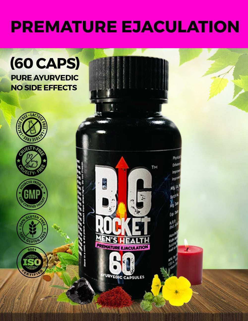 BigRocket Men's Health Premature Ejaculation capsules use the ancient principles of Ayurveda to prevent and treat premature ejaculation in men. Premature Ejaculation is basically a condition in which men ejaculate sooner during sexual intercourse than he or their partner would like.BigRocket Capsules for Premature Ejaculation use pure herbal extracts of time-tested herbs to provide endurance and stamina that modern-day men are lacking because of stress, poor diet and lifestyle habits, and other environmental factors.